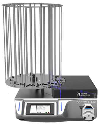 El DISTRIWEL 440 es un dosificador de medios automatizado, o mejor dicho, un apilador de medios (placas de Petri). Se trata de un sistema totalmente automático que garantiza una dosificación estéril, una alta productividad (750 placas vertidas en 60 minutos) y un medio de alta calidad (solidificación rápida gracias al efecto Peltier).